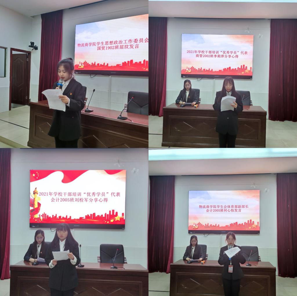 接着,思想政治工作委员会主任屈玟、体育部副部长何心怡、商管2002班李莉萍、会计2005班刘检军作为2021年学校干部培训“优秀学员”依次上台分享自己的心得体会。