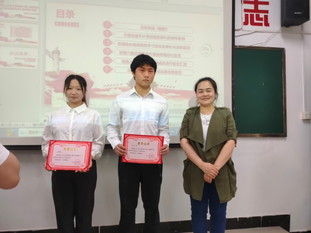 结业典礼在奏唱国歌中拉开帷幕,由学生干事刘富建老师宣读此次培训班优秀学员名单,各党支部老师为受表彰的学员颁发荣誉证书。获得优秀学员表彰的学员有十二位,优秀学员代表侯思梅发言,她详细阐述了从对党的陌生到主动学习党章的过程。她说道:“作为新时代的大学生入党积极分子,我们要努力发扬大学文化精神,以出色的表现,饱满的热情为周围同学们做出表率。党课虽然结束,但对中国共产党的认识和追求并没有结束,我们将会继续以身边党员作为学习榜样,严格要求自己。