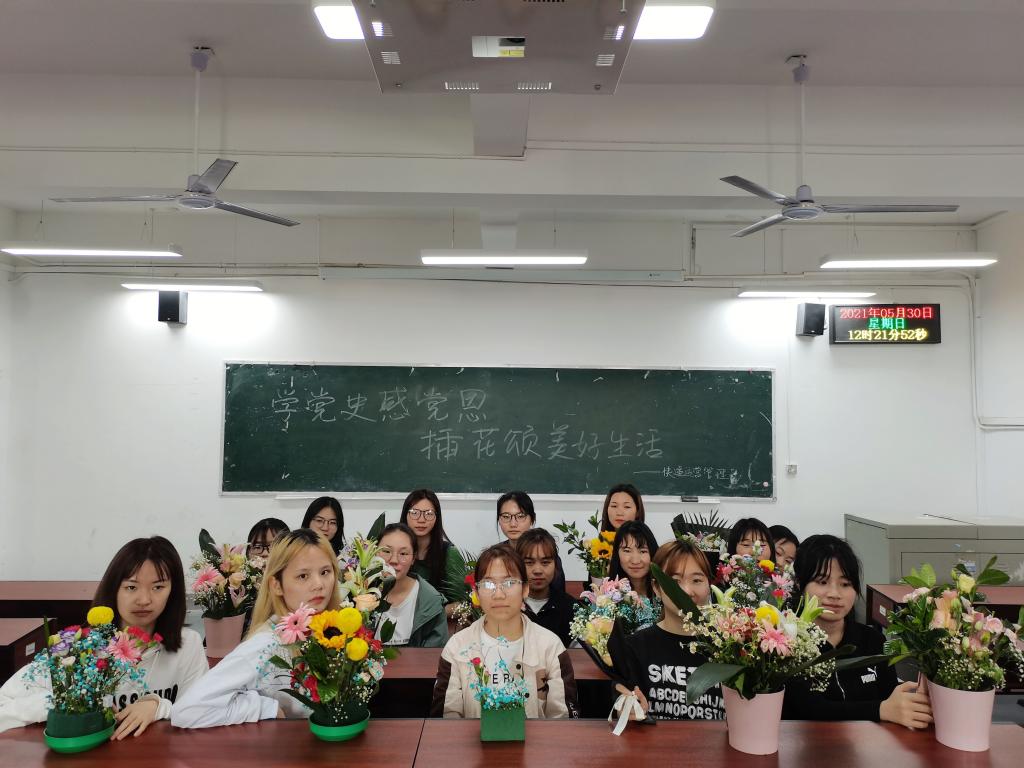 严玉珍、彭欢连是该环节负责人,“这次活动没想到这么受欢迎,我们利用《学习强国》app学习插花课程,自己当老师,自己设计,并把作品与党史经典进行融合创作,同学们给每一个作品都精心的准备了一份介绍,我们还把作品制作成投票链接,让更多的同学通过作品了解背后的党史经典,得到了老师和同学们的点赞。”