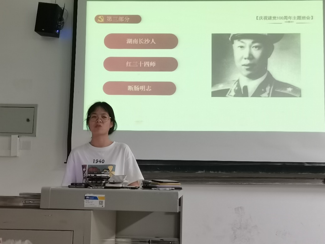 班会第三个环节是红色人物密码,由班上四名入党积极分子用关键词提示的方式来引出所要介绍的革命英雄人物,包括萧克、陈树湘、谢晋元、董必武等,四位入党积极分子结合本班和自身实际严肃认真地查找班风学风存在问题,声情并茂地畅谈如何在学习和工作中继承先烈们的遗志,传承先烈们的精神。