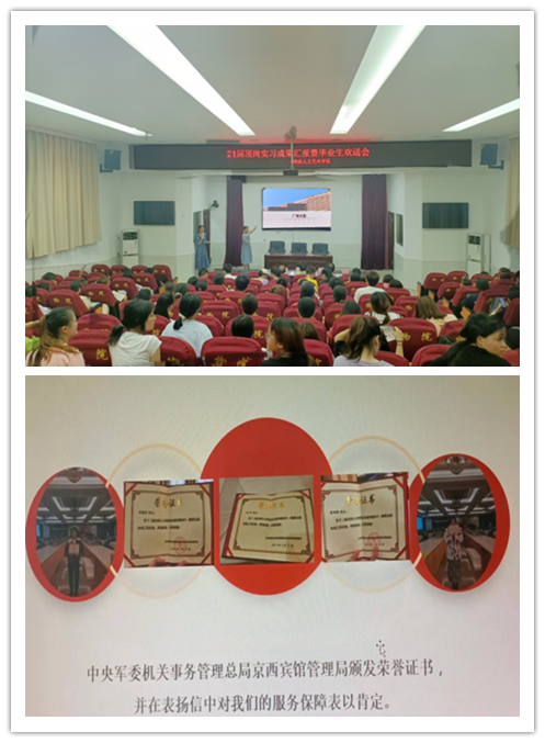 北京湖南大厦实习优秀学生代表李慧玲、曾雨绵、柳烨三位同学分享了在京西宾馆服务“两会”的心得体会。展示了中央军委机关事务管理总局京西宾馆管理局颁发荣誉证书及表扬信。她们表示这次实习收获满满:“这次京西之旅让我成为了一名讲政治、顾大局、守纪律、肯奉献的同志,这里我非常感谢管理局给予我这么高的评价……我也必将在今后的生活中更加严格要求自己,严谨作风,为人处事做到谦虚谨慎,发扬吃苦耐劳、敬业奉献的精神,进一步增强自身使命意识和职责意识,让思想和行动统一发扬两会精,在以后的工作中要立足本职岗位,作出业绩,为祖国走向富强贡献一份绵薄之力。”