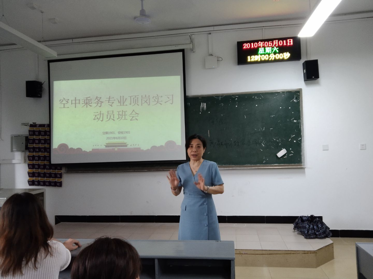 6月18日,2019级空中乘务专业顶岗实习主题班会在教学楼101召开。班会由辅导员王根茂主持,院长刘淑一参与指导,空乘1901班、安检1901班全体成员参与。