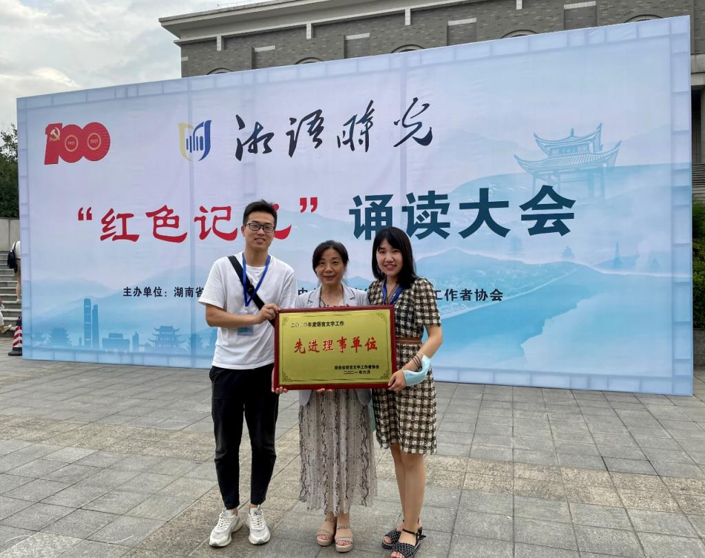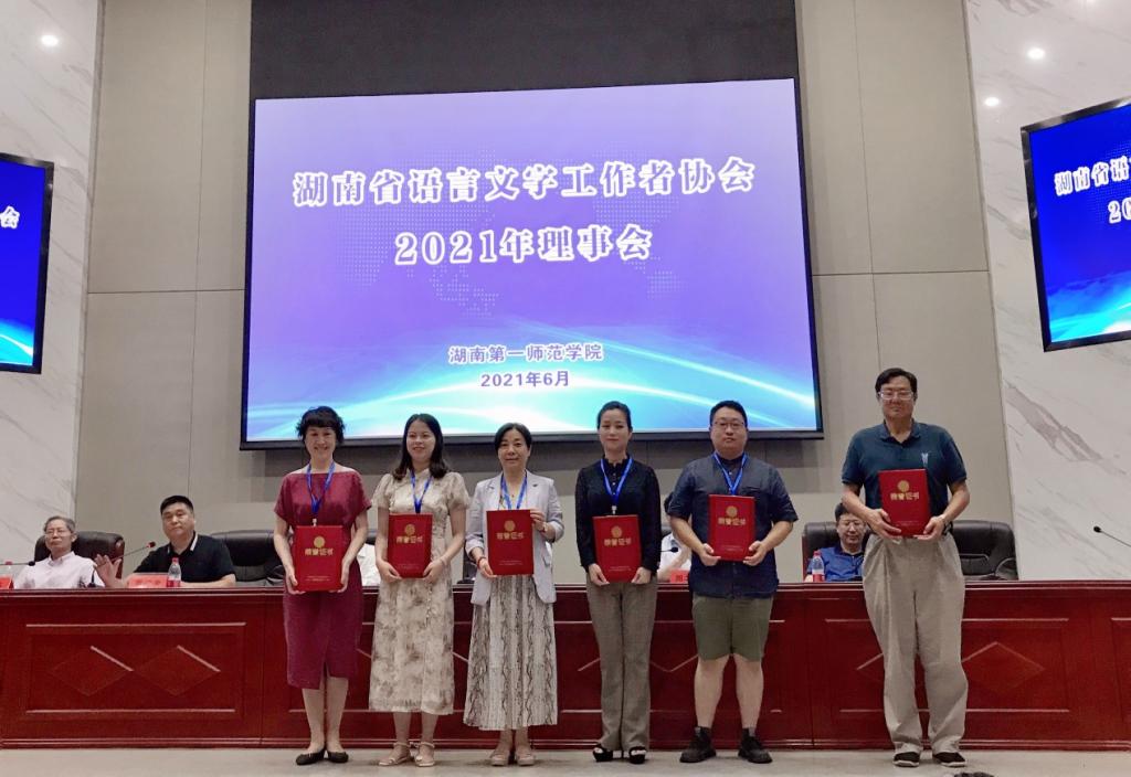 6月29日,湖南省语言文字工作者协会2021年理事会议暨《湘语时光》诵读大会在湖南第一师范学院举行。会议由湖南省语言文字工作者协会主办,旨在总结经验、表彰先进、庆祝中国共产党建党100周年。湖南第一师范学院校长童小娇,语言文字培训测试中心主任冯传书,副主任鄢明芳、白昕等领导嘉宾出席会议,我院刘淑一院长、黄洁老师、王根茂老师与会并接受表彰。
