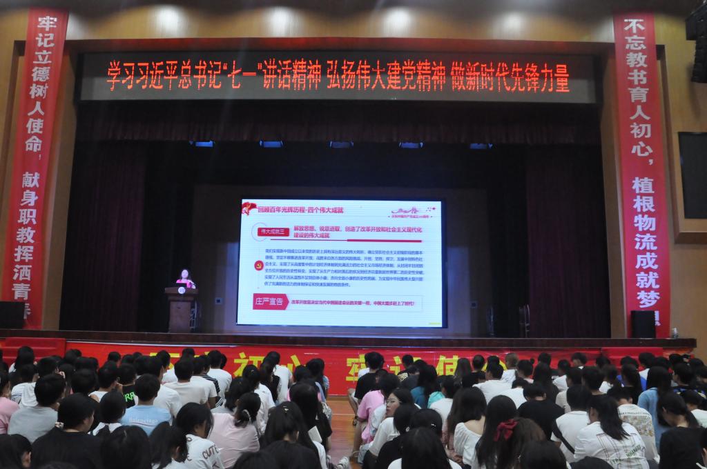 9月27日上午11:00,物流商学院党总支书记储昱同志在体艺馆给预备党员、党员发展对象、入党积极分子和2021级新生进行了学习习总书记“七一”重要讲话精神宣讲,宣讲主题为“弘扬伟大建党精神,做时代先锋力量”。
