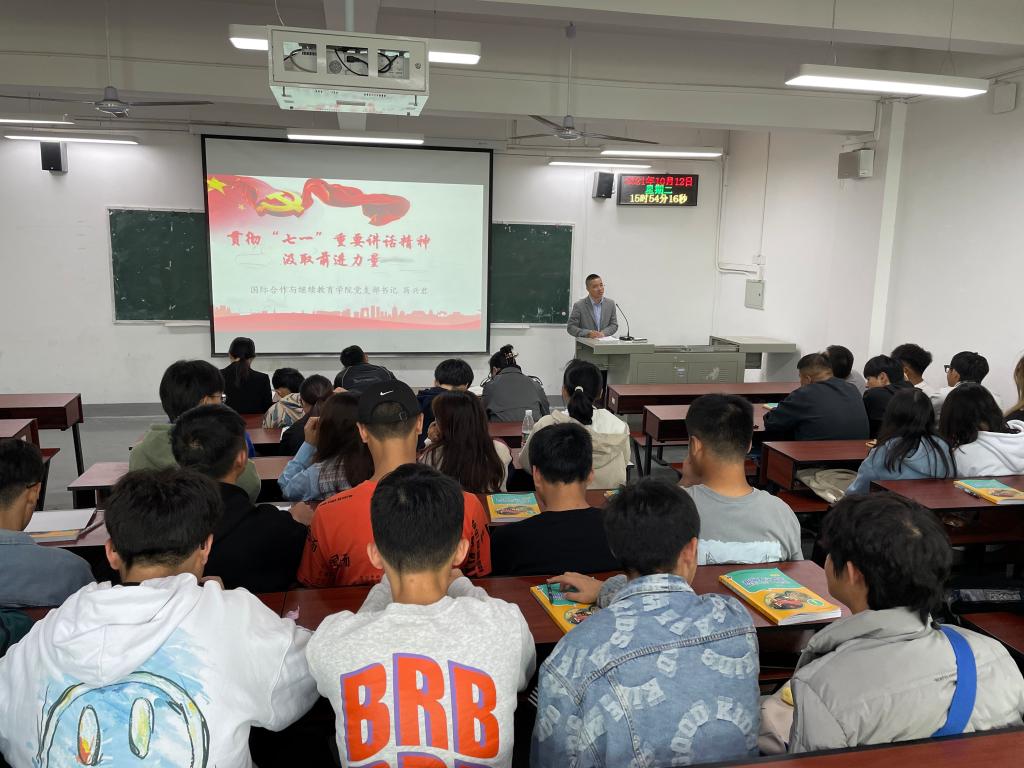 10月12日下午,国际合作与继续教育学院党支部书记蒋兴君在教学楼113教室为全院教职工、入党积极分子和中德2021级新生上了一堂生动的党课,主题为:贯彻“七一”重要讲话精神汲取前进力量。