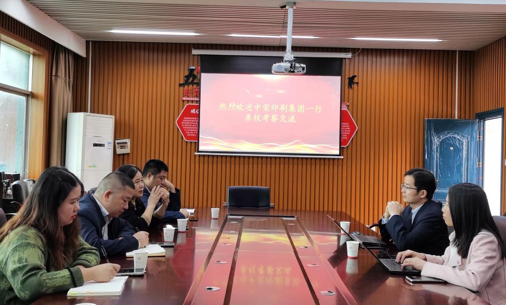 10月13日下午,中荣印刷集团股份有限公司中山分公司人力资源总监温俊伟、人力资源部经理何东旭来校就推进校企合作相关事宜进行洽谈。物信学院党总支书记刘丽军、副院长杨晓峰、包装设计与策划专业带头人向明月、专业教师唐丹、综合干事丁晓参与洽谈。