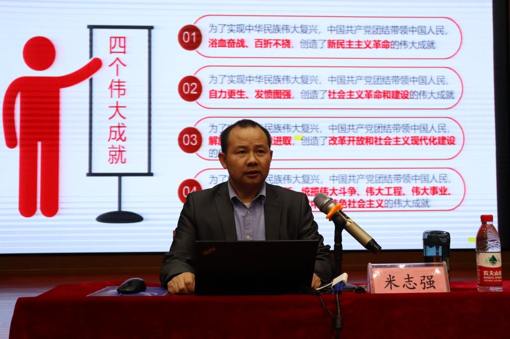 在宣讲会上,米志强首先回顾了中国共产党百年来的光辉历程,讲述了中国共产党为实现中华民族伟大复兴所取得的四个伟大成就。然后,米志强深入浅出地诠释了中国共产党的九种伟大建党精神和共产党员的人民初心。接着,米志强在宣讲中讲述了中国共产党人在这一百年中坚持真理,坚守理想,英勇斗争,对党忠诚,不负人民的精神。最后,米志强寄语物信学子,作为新时代青年大学生,要以实现中华名族伟大复兴为己任,增强做中国人的志气、骨气、底气,不负时代,不负韶华,不负党和人民的殷切期望。