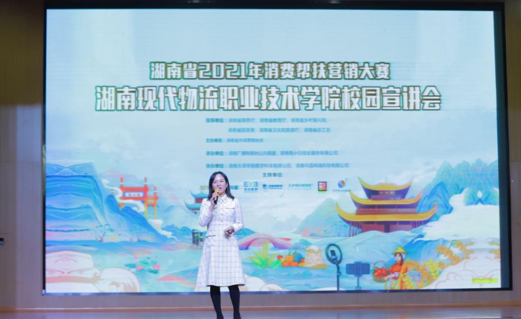 11月16日,湖南省2021年消费帮扶营销大赛华亿在线校园宣讲会在学院体艺馆隆重召开。该项大赛是由湖南省商务厅、教育厅、乡村振兴局、人民政府国有资产监控管理委员会、文化和旅游厅、总工会6部门共同指导进行。大赛组委会副主任禹梦兰,我校党委书记龙吟,副校长陈建华,物流商学院党总支书记储昱,副院长、此次学校营销大赛总组织旷健玲,我校全体参赛教师、部分学生代表出席了本次会议。会议由物流商学院院长刘意文主持。