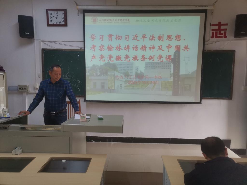 10月16日下午,物流人文艺术院党总支书记李烁在崇技楼403语音室为学院全体党员教师上了一堂以《学习贯彻习近平法治思想、考察榆林讲话精神及中国共产党党徽党旗条例》为题的党课。