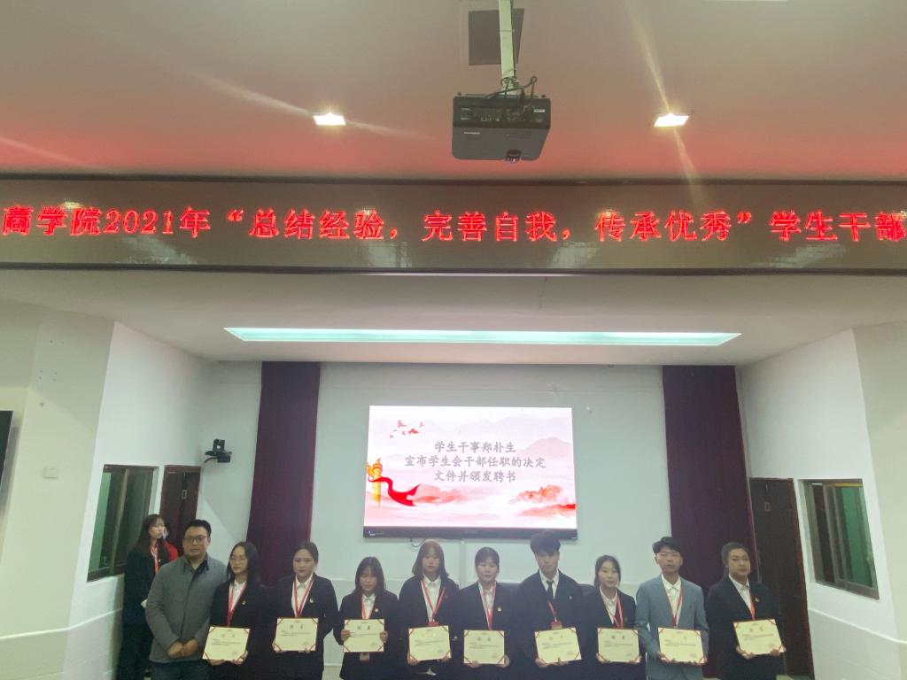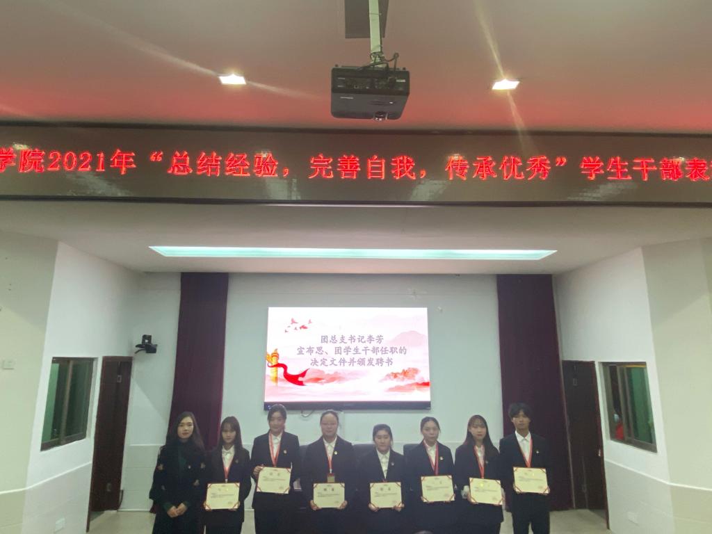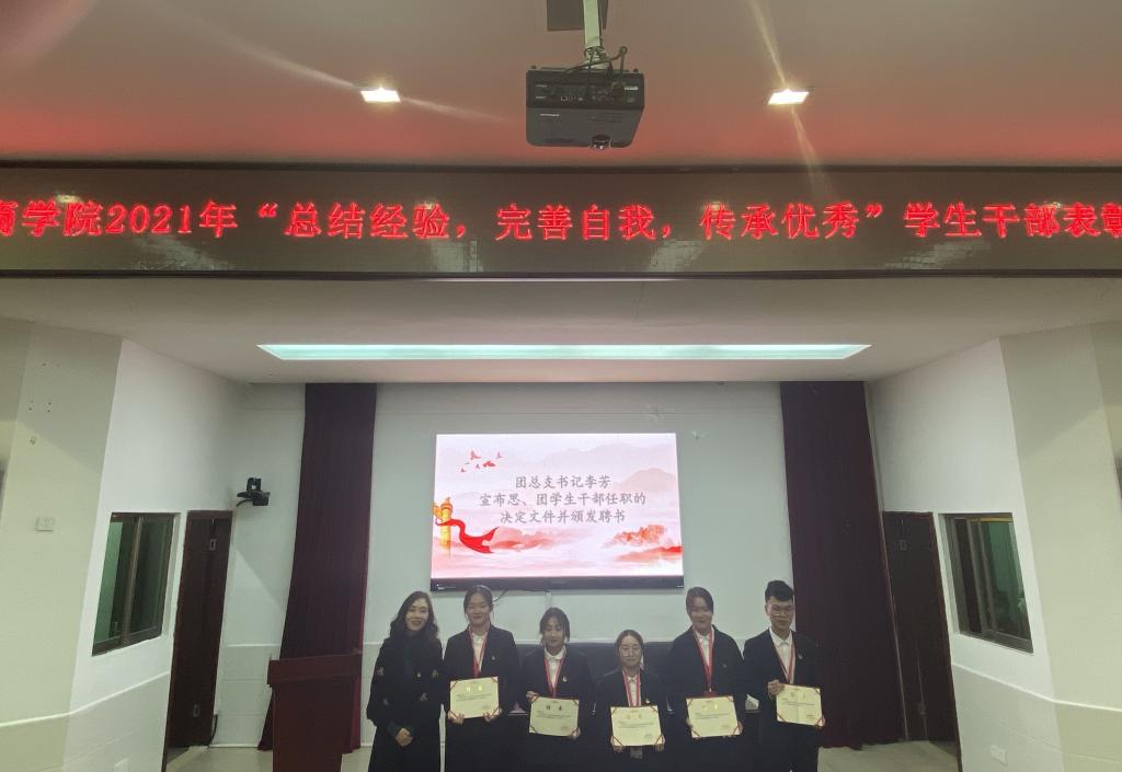 2021年11月23日中午12点40分,物流商学院2021年“总结经验、完善自我、传承优秀”学生干部表彰大会在学术报告厅召开,院长刘意文、党总支书记储昱、团总支书记李芳、学生干事郑朴生、专职辅导员龚君豪、何莉洋、陈珊及思团学学生干部参加了本次会议。团总支专职委员李香媛主持。